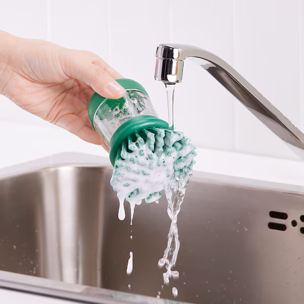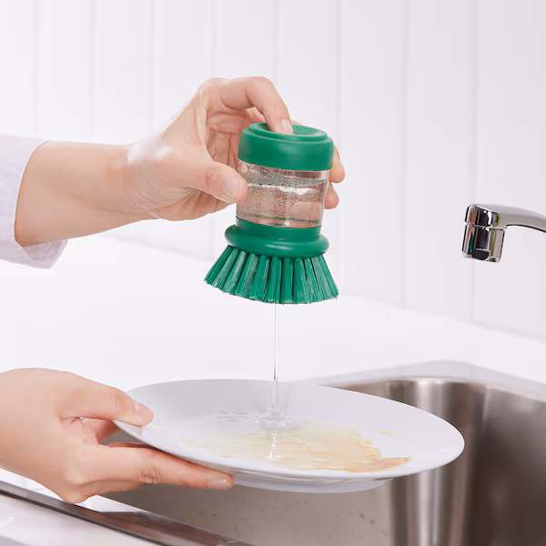 از این برس برای تمیز کردن سریع ظروف استفاده کنید. کافیست دسته را با مایع ظرفشویی پر کنید، کمی فشار به قسمت بالای آن وارد کنید و به همین سادگی – چربی و بقایای غذا از بشقاب‌ها و ماهی‌تابه‌ها محو می‌شوند.
